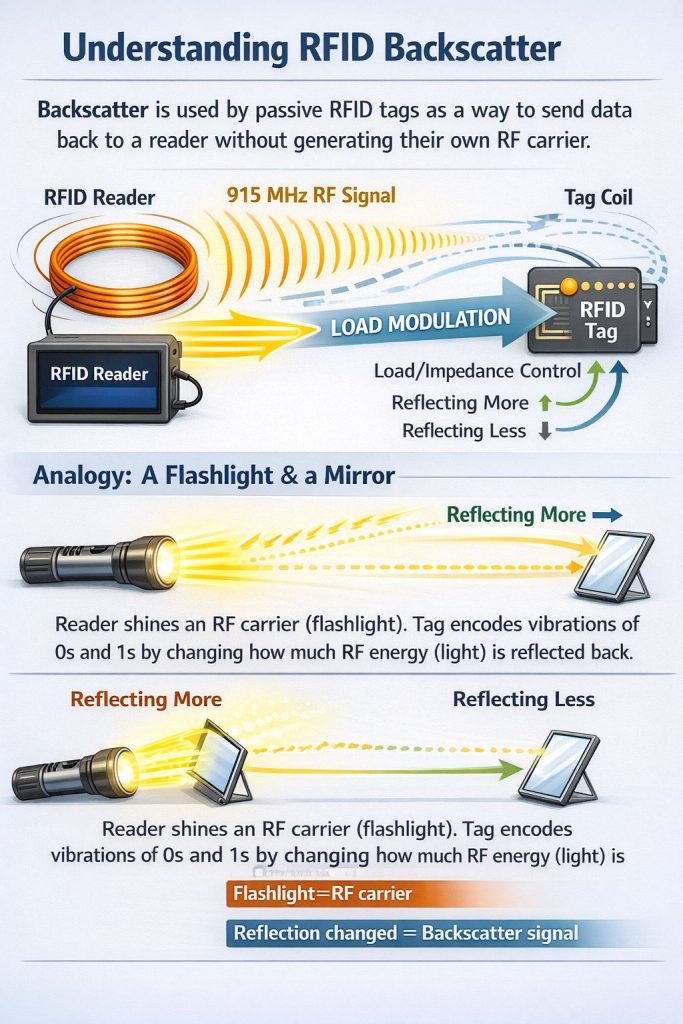 A reader shines a flashlight (RF carrier). The tag “blinks” by changing how reflective it is—encoding 0s and 1s in that reflection.