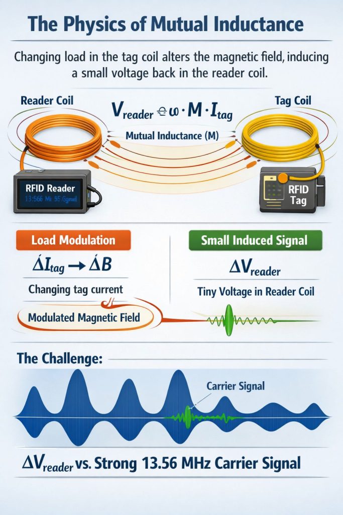 Two coils near each other have mutual inductance (M). When the tag changes its load, the tag coil current changes. That changes the magnetic field, which induces a small voltage/current change back at the reader coil. Mutual inductance is the core physical principle behind inductively-coupled RFID.